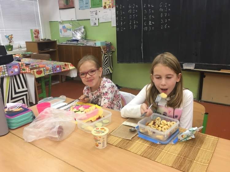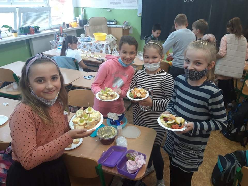 Takýmito slovami sme sa riadili v týždni od 11.10 do 15.10.2021, ktorý bol zameraný na kreatívne a inovatívne nápady na vzdelávanie v oblasti potravín a výživy. Žiaci sa vo výtvarných prácach zameriavali na obilniny, cestu zemiaka či chlebíka. Nechýbala potravinová pyramída. Ovocie predstavili vo svojich referátoch, či priamo na tanieri. Ochutnávali a pripravovali rôzne nátierky. Vyhlásenú dennú tému Jedz, hýb sa a dodržiavaj pitný režim sme spojili so štafetovým behom, ktorý absolvovala celá škola. Za splnené úlohy boli žiaci odmenení diplomom a sladkosťou.