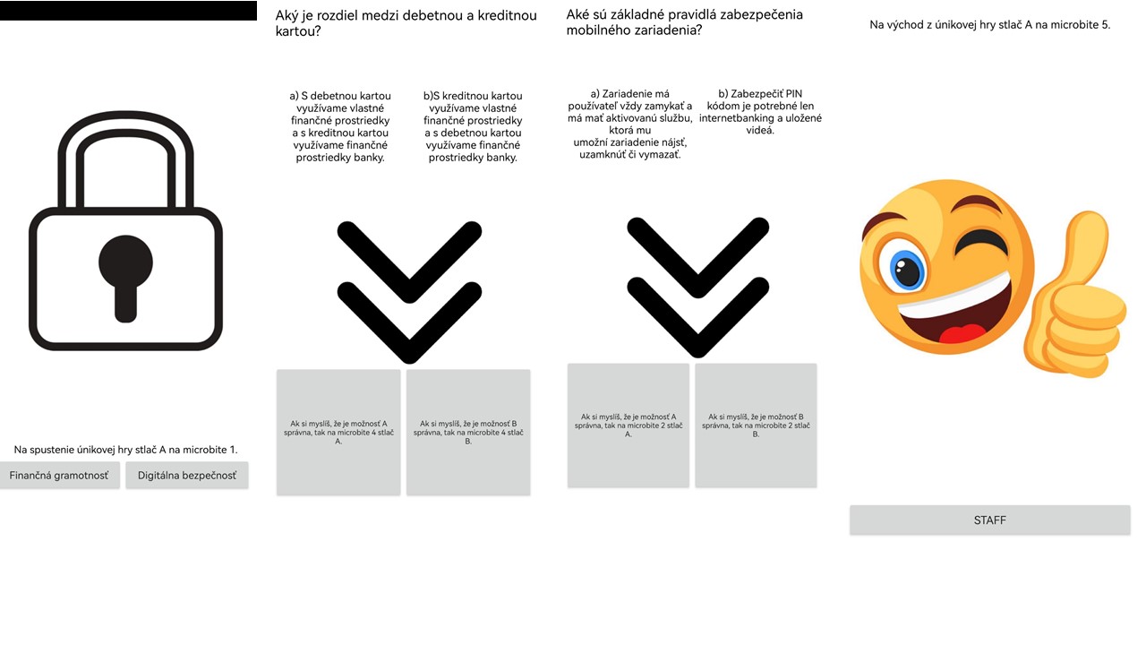 Skombinovali sme 3D prvky, BBC micro:bity a vytvorenú aplikáciu. Výsledkom je skvelá úniková hra! Hráč si vyberá jeden z dvoch okruhov a otestuje si vedomosti z finančnej gramotnosti alebo digitálnej bezpečnosti.