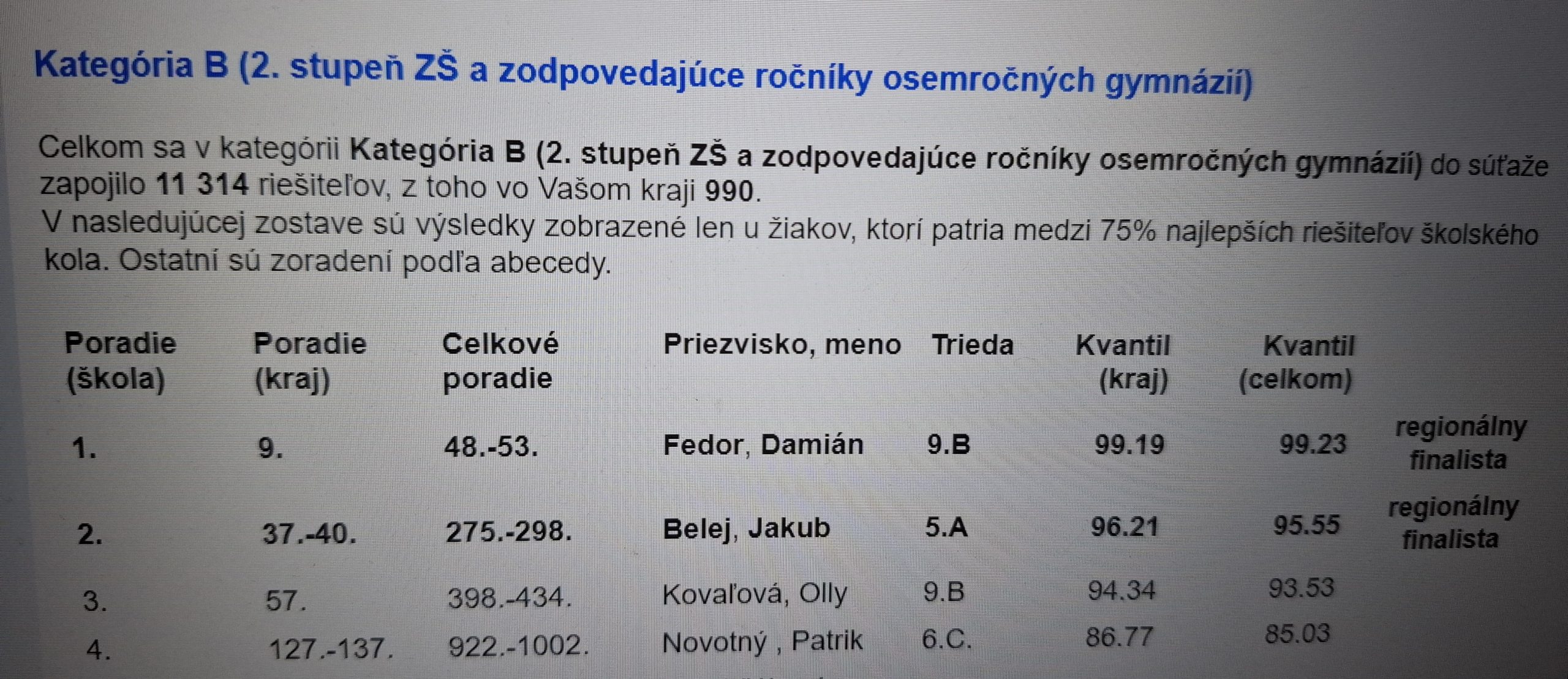 Výsledky školského kola IQ olympiády nás veľmi potešili. Spomedzi zapojených tisícov žiakov druhého stupňa základných škôl na Slovensku sa v prvej tisícke umiestnili štyria naši žiaci. A dvaja z nich postúpili na regionálne kolo Východ, ktoré sa konalo 16.5.2025 na rektoráte UPJŠ v Košiciach. Postupujúci žiaci Damián Fedor z 9. B a Jakub Belej z 5. A mali možnosť prežiť jeden deň riešením logických úloh vo vysokoškolskej aule. A zvládli to so cťou! Damián si „vyrátal“ 25. miesto a Jakub 50. miesto (ako najmladší účastník) z 80 prítomných súťažiacich.